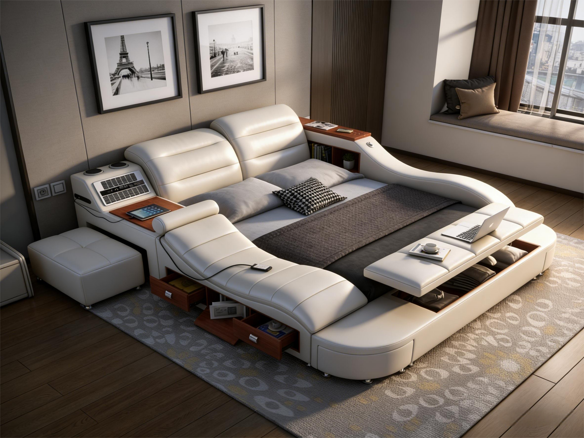 Multifunctional Cabinet with Lift-Up Vanity Mirror, Air Purifier, Bluetooth Speaker, Digital Safe, USB Charging Ports, Two Storage Drawers, Electric Massage, and Bench/Footstool